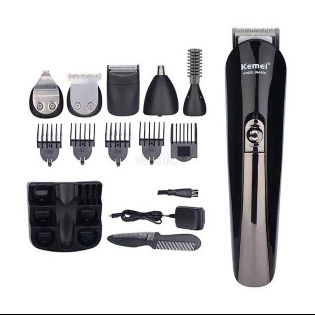 Kemei KM-600 11-in-1 Grooming Kit একটি মাল্টি-ফাংশনাল গ্রুমিং কিট যা পুরুষদের জন্য হেয়ার, দাড়ি, শরীর ও নাক ট্রিমিংসহ বিভিন্ন গ্রুমিং প্রয়োজনীয়তা পূরণ করে।