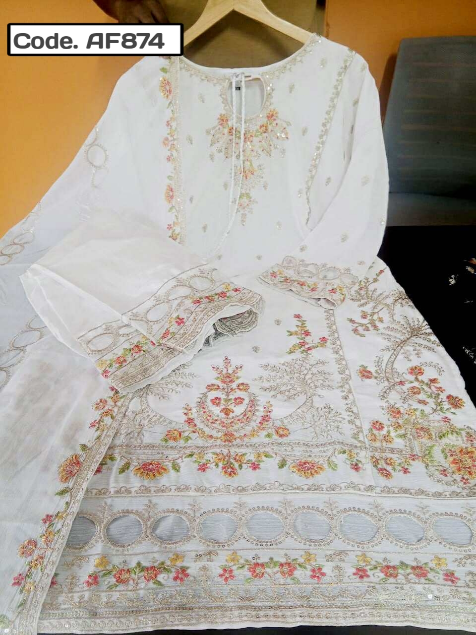 Sadabahar soft organja with embroidery sequence neck pannel hand ston work Code. AF874